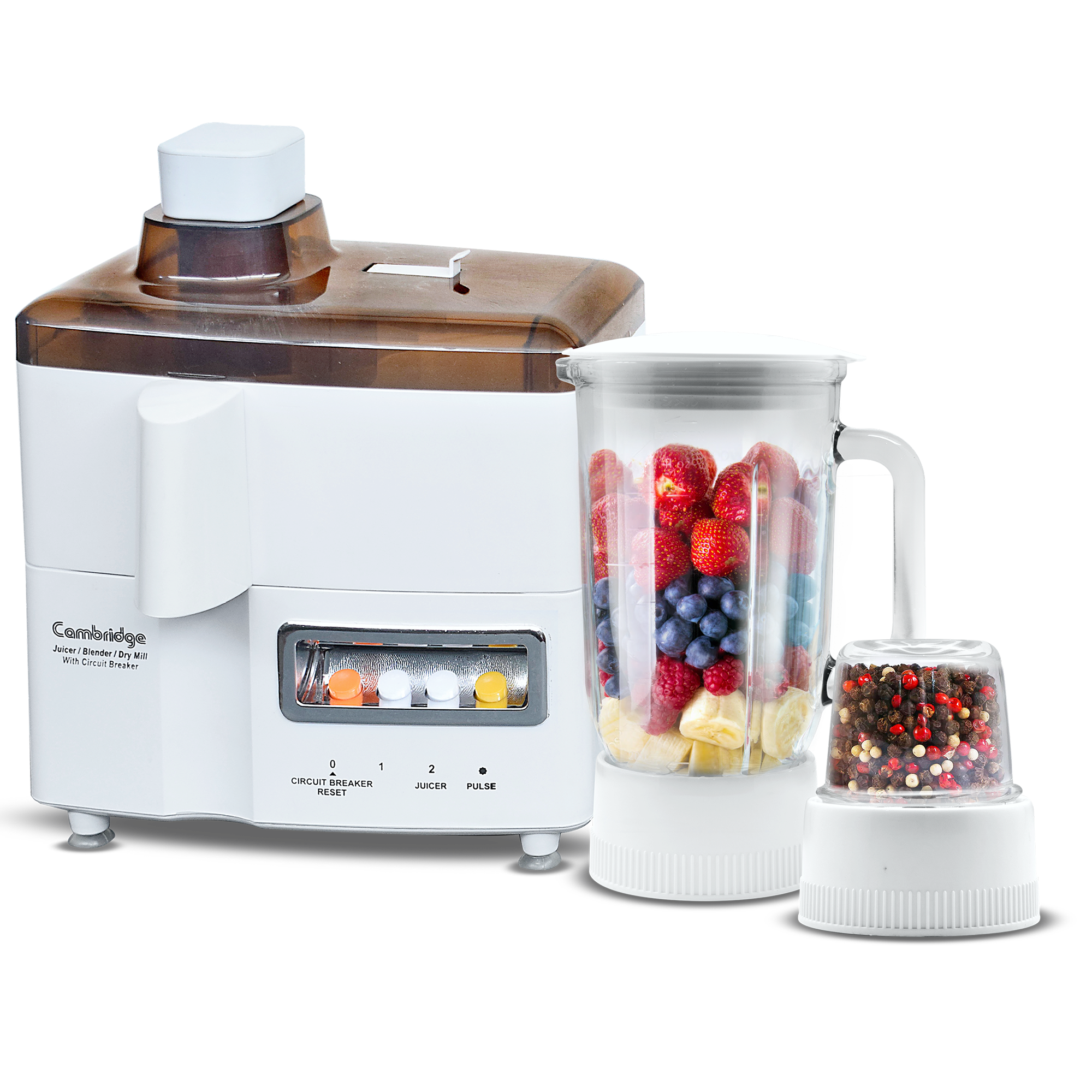 The Cambridge JB400 3in1 Juicer Blender is the ultimate kitchen companion, offering juicing, blending, and grinding capabilities in a single appliance. Whether you're crafting refreshing juices, silky smoothies, or grinding spices, this versatile machine delivers exceptional performance. Simplify your culinary tasks with its user-friendly design and robust build.